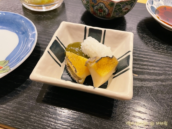 속을 달래면서 입안을 행복하게 해 줄 음식들이 가득 차려집니다. 샐러드, 계란찜(자완무시), 아뮤즈부쉬, 회를 주시면서 코스가 시작됩니다.