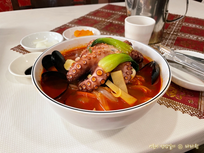 점심 시간이 한참 지난 시간에 찾아가니 조용했습니다. 벽에 붙어 있는 메뉴를 훑어보는 중, 문어 황제짬뽕이 눈에 띄었습니다. 낙지 한 마리를 통째로 얹어주는 황제짬뽕을 좋아하는데, 문어 한 마리라니 기대가 되었습니다. 주문을 했더니 사장님이 걱정스러운 눈빛으로 양이 상당히 많아서 다 못 먹을거라고 하셨습니다. 그러나 이미 문어 황제짬뽕에 꽂힌 터라 괜찮다고 달라고 말씀드렸습니다. 사장님은 못내 걱정이 되시는지 그러면 면을 좀 빼드릴까냐고 물으셨습니다.