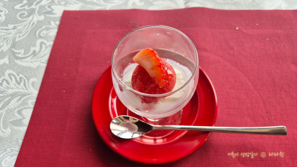 딸기 샤베트 입니다. 딸기 맛이 응축된 맛 입니다. 아래에는 묽게 요거트와 아이스크림이 살짝 깔려 있습니다. 음식 서브 속도도 아주 좋습니다. 멀리서 제가 먹는 것을 보고 있다가 식기를 내려 놓고 강 보기 시작하면 딱 맞춰 다음 요리를 가져다 주십니다.
