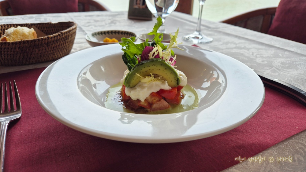 샐러드 입니다. 카프레제 샐러드를 재해석한 것이라고 합니다. 치즈도 여기서 직접 만드셨다고 합니다. 빵도 직접, 치즈도 직접? 이라며 놀라다 보면, 계속해서 '직접 만든'의 향연이 이어졌습니다. 보들보들한 치즈, 적당한 크기로 썬 토마토와 야채들, 바질 소스가 잘 어울립니다.