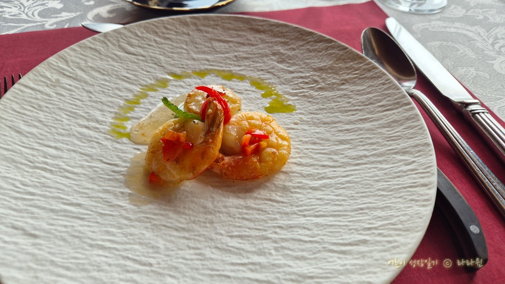 가리비와 새우 에피타이저 입니다. 새콤달콤 맛있습니다.