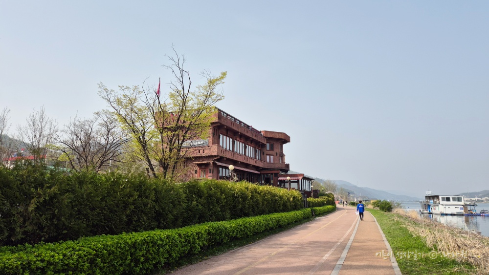 창 밖으로 보이는 북한강, 산, 산책로를 오가는 사람들을 보고 있노라면 평온해집니다. 아름다운 커피에 아름다운 음악까지.. 세상 행복합니다. 식사 후 나와서 북한강 산책로를 거닐어도 좋습니다. 산책로로 이어지는 입구가 바로 옆에 있습니다.