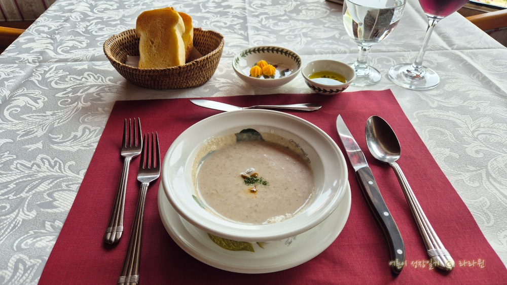에스카르고 (달팽이)를 올린 양송이 스프 입니다. 진하고 맛있습니다. 이 때부터 감동이 시작되는데, 저 빵은 좋은 밀가루로 여기서 직접 만들어 구어 주신 것 입니다. 따끈하고 아주 맛있습니다. 버터도 좋은 버터였고, 올리브오일과 발사믹 식초도 훌륭합니다.